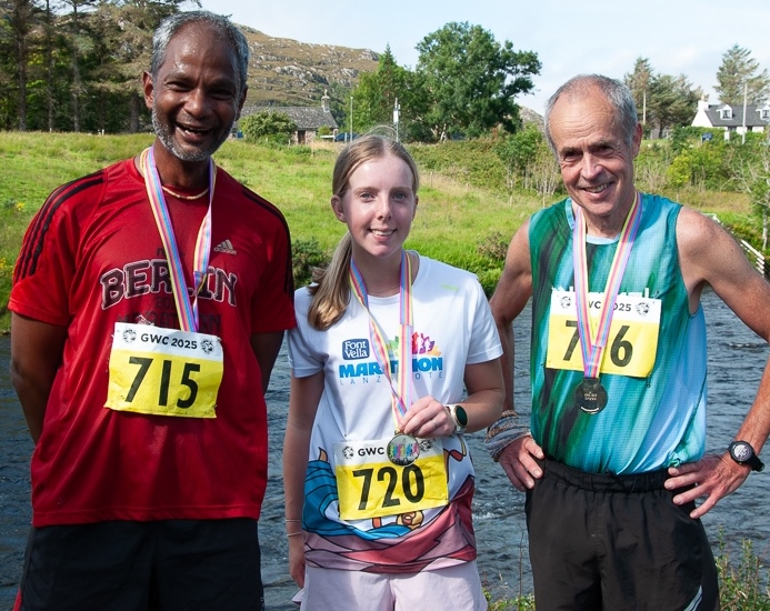 Akash Devendra (Inverness) 3rd, Beth McCluskey (Larne) 2nd and Steve Worsley (Inverness) winner in the 10k race at Poolewe 2025